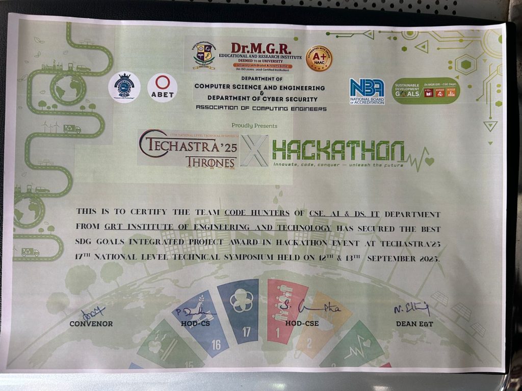 This four-year degree programme will certainly provide a roadmap to advance the profession and career growth of the students. The leading Artificial Intelligence and Data Science colleges in GRT Institute engineering and Technology provide high-end processing systems with seamless Wi-Fi connectivity, essential software and tools for students to apply learning from theory classes to the real world and analyze their results. The bachelor’s course on Artificial Intelligence and Data Science in this Institute was started in the year of 2022 with an intake of 60 students.